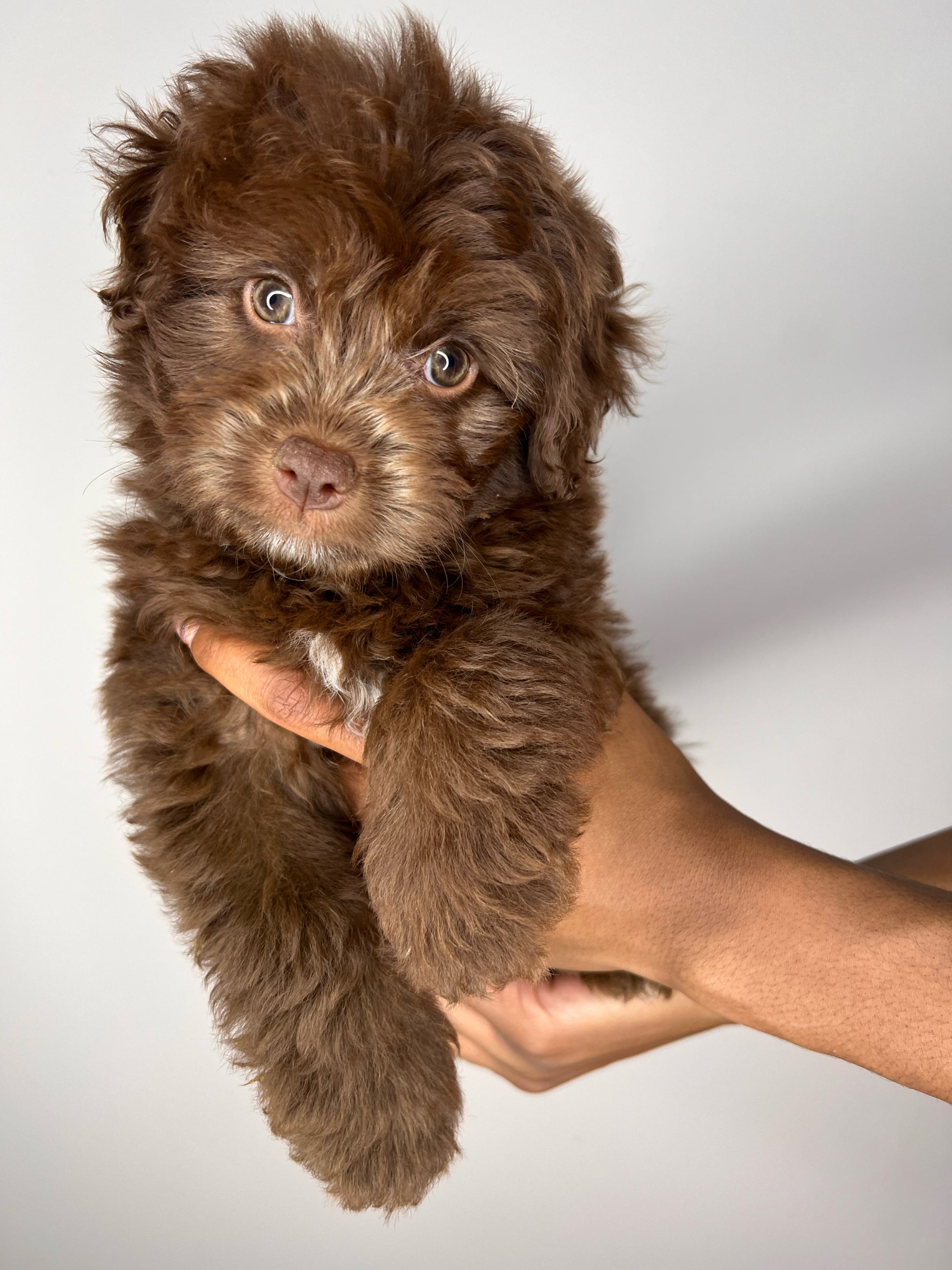 Channie is a very sweet mini aussiedooodle puppy who loves to run and play. She has a gorgeous chocolate coat and beautiful bright eyes. Her date of birth is 9/3/24. Her mom is a miniature poodle, dad is an aussiedoodle.