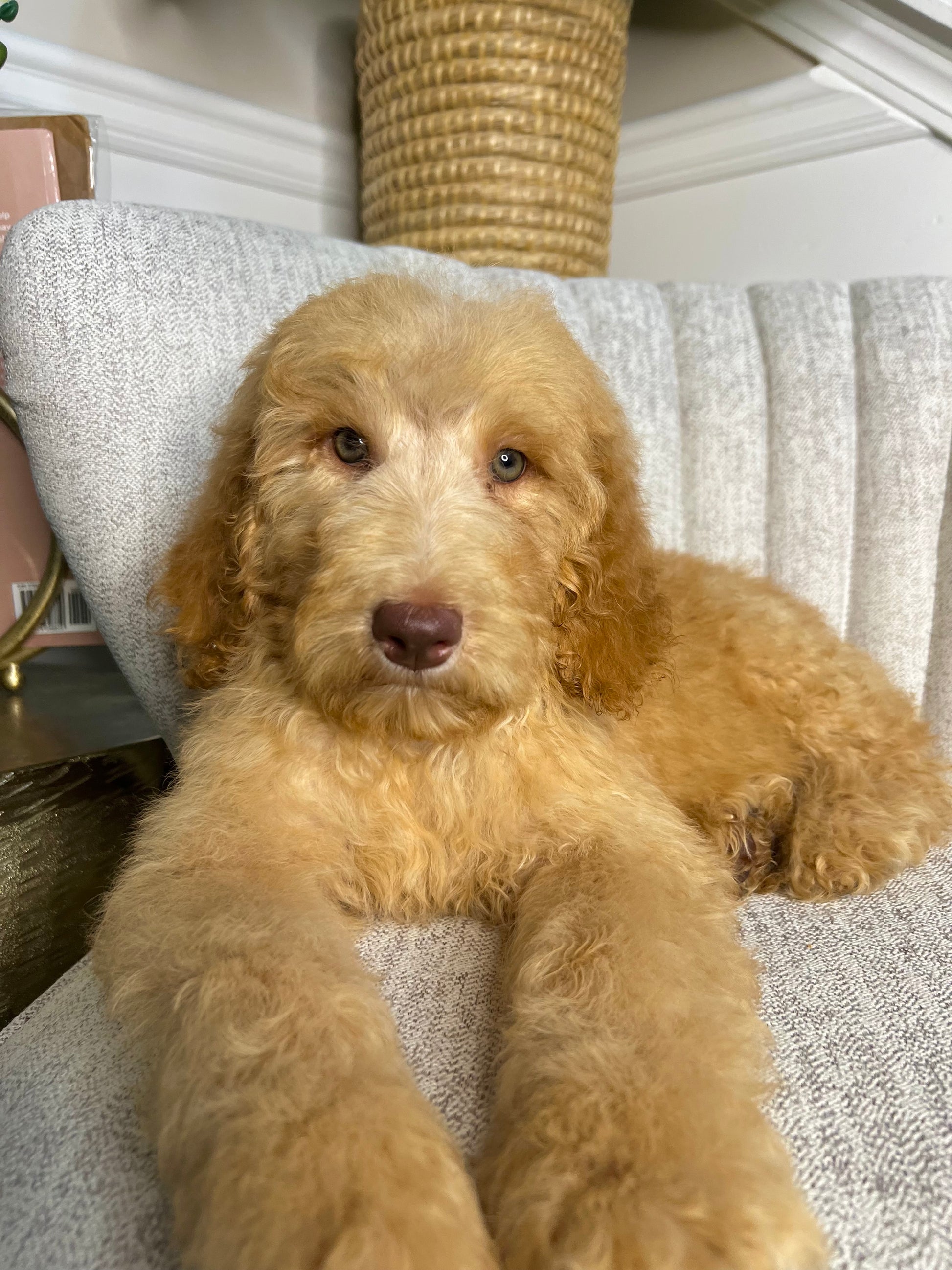 This cute pup has the most gentle, laid back personality and the most beautiful eyes. He’s a standard F1B Goldendoodle and he should be about 40 pounds when he’s done growing. He comes vet checked and up to date on vaccines and deworming. He is super sweet and affectionate and with proper training, would make a great emotional support or service dog.