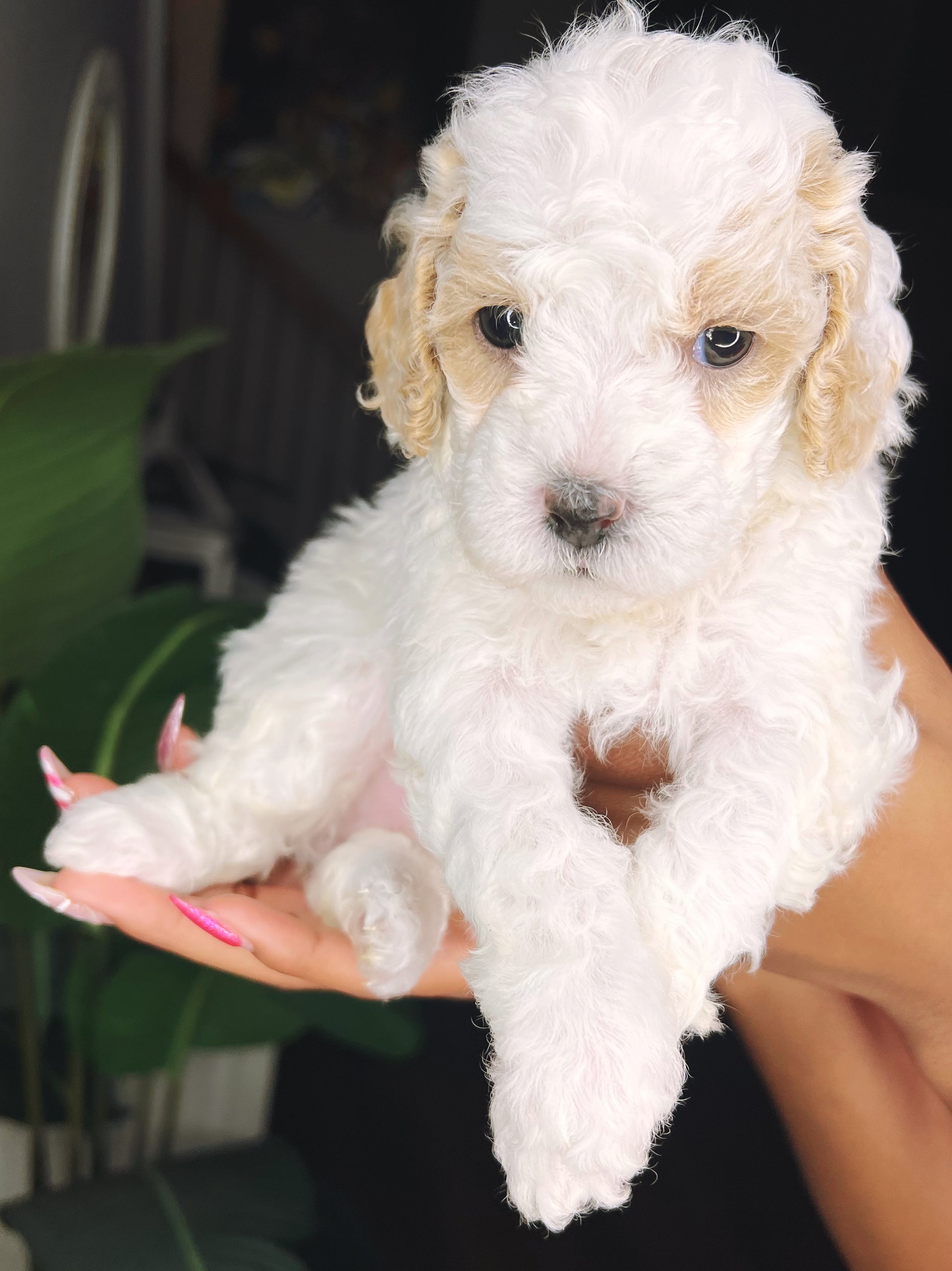 Darling is a sweet Cockapoo puppy who loves cuddles and playtime. She has a beautiful white coat and captivating brown markings. Darling will join her new family microchipped, current on vaccinations and dewormer. She has received lots of love and attention which has helped build great confidence. Darling was born 12/23/24 and is expected to weigh approximately 14 pounds full grown.