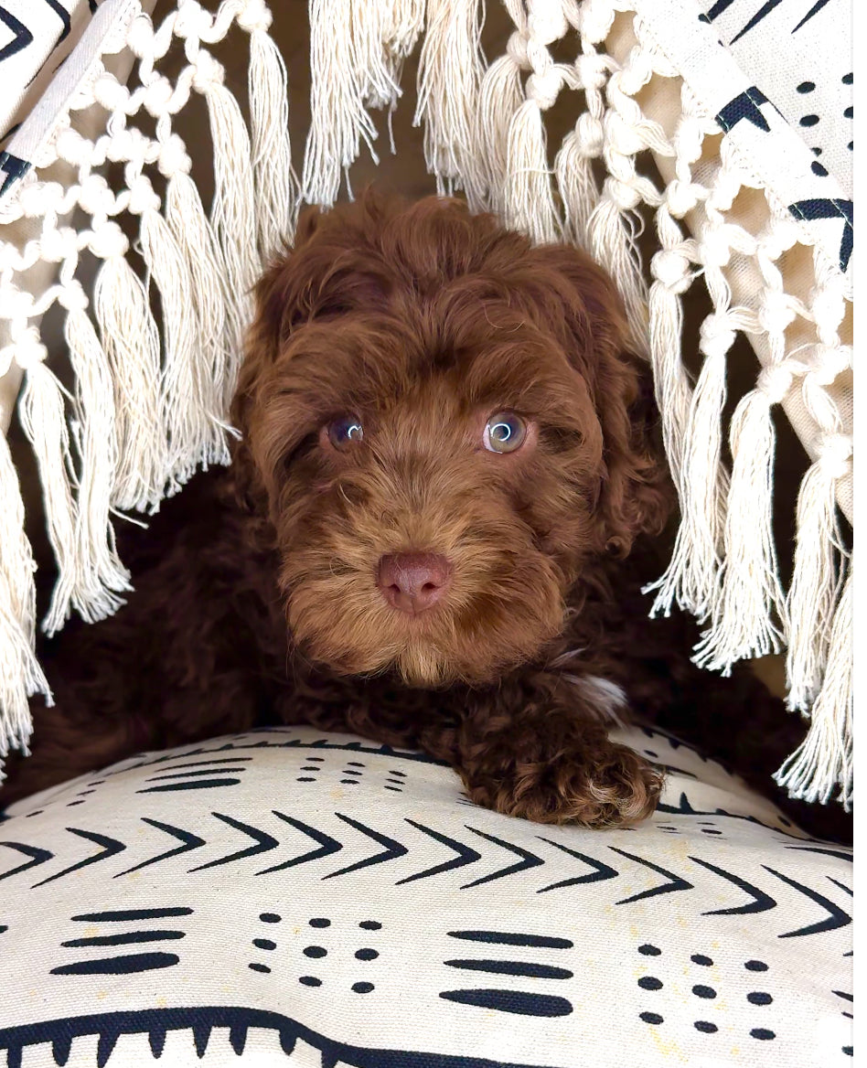 Frankie is a very playful puppy who loves people. He has a beautiful chocolate coat and bright eyes! Frankies date of birth is 9/9/24. He will join his new family current on vaccinations and dewormer. He has been receiving lots of love and attention which has helped build great confidence.