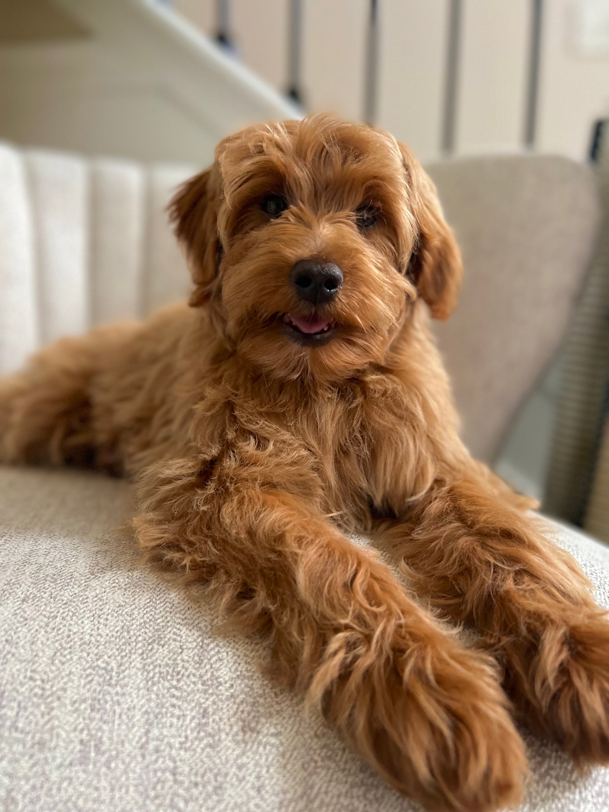 This female Red Mini Goldendoodle puppy (without white chest, on the right) is very playful and sweet. She comes crate trained and up to date on shots and dewormer.