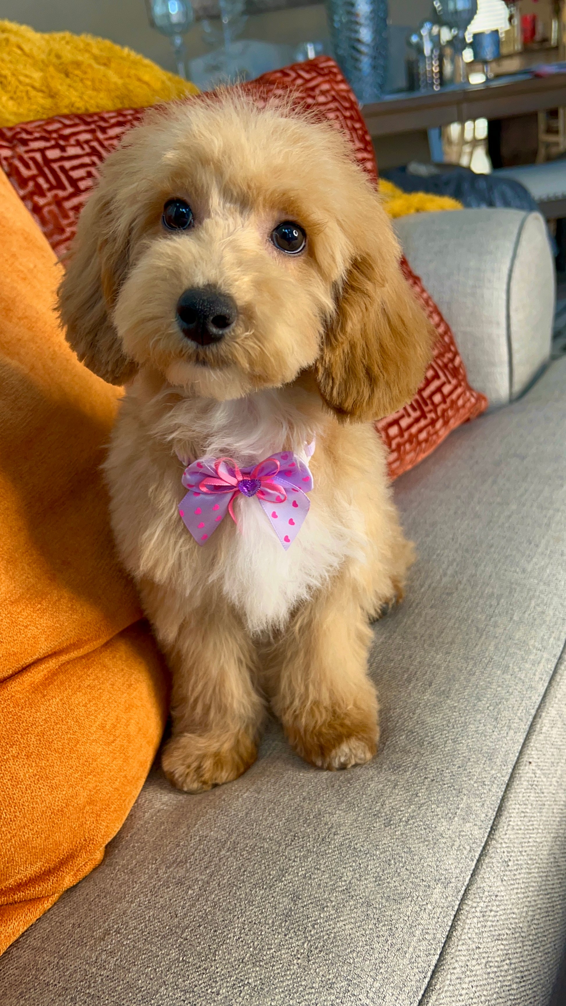 Goldie is a sweet poochon with a beautiful curly coat. She comes up to date on shots and deworming. Goodie’s soft coat and playful personality are sure to steal your heart. She is expected to mature to about 12lbs. Goldie is waiting to become a member of your family!