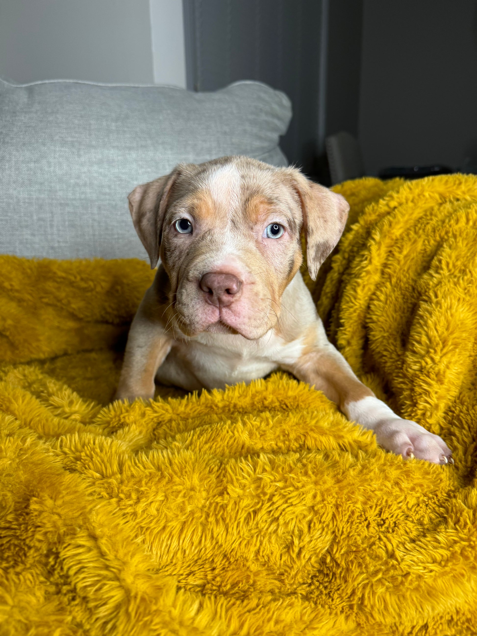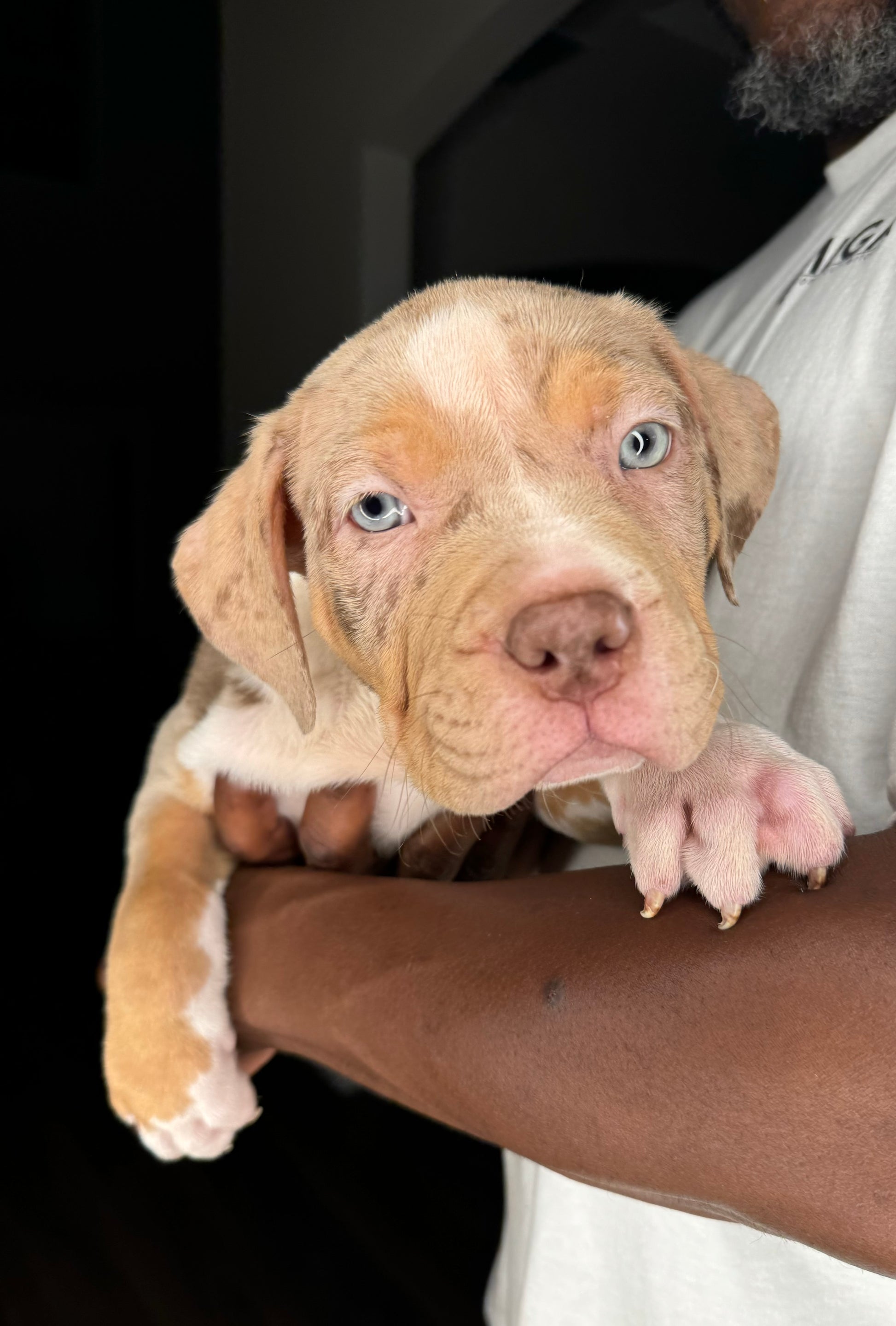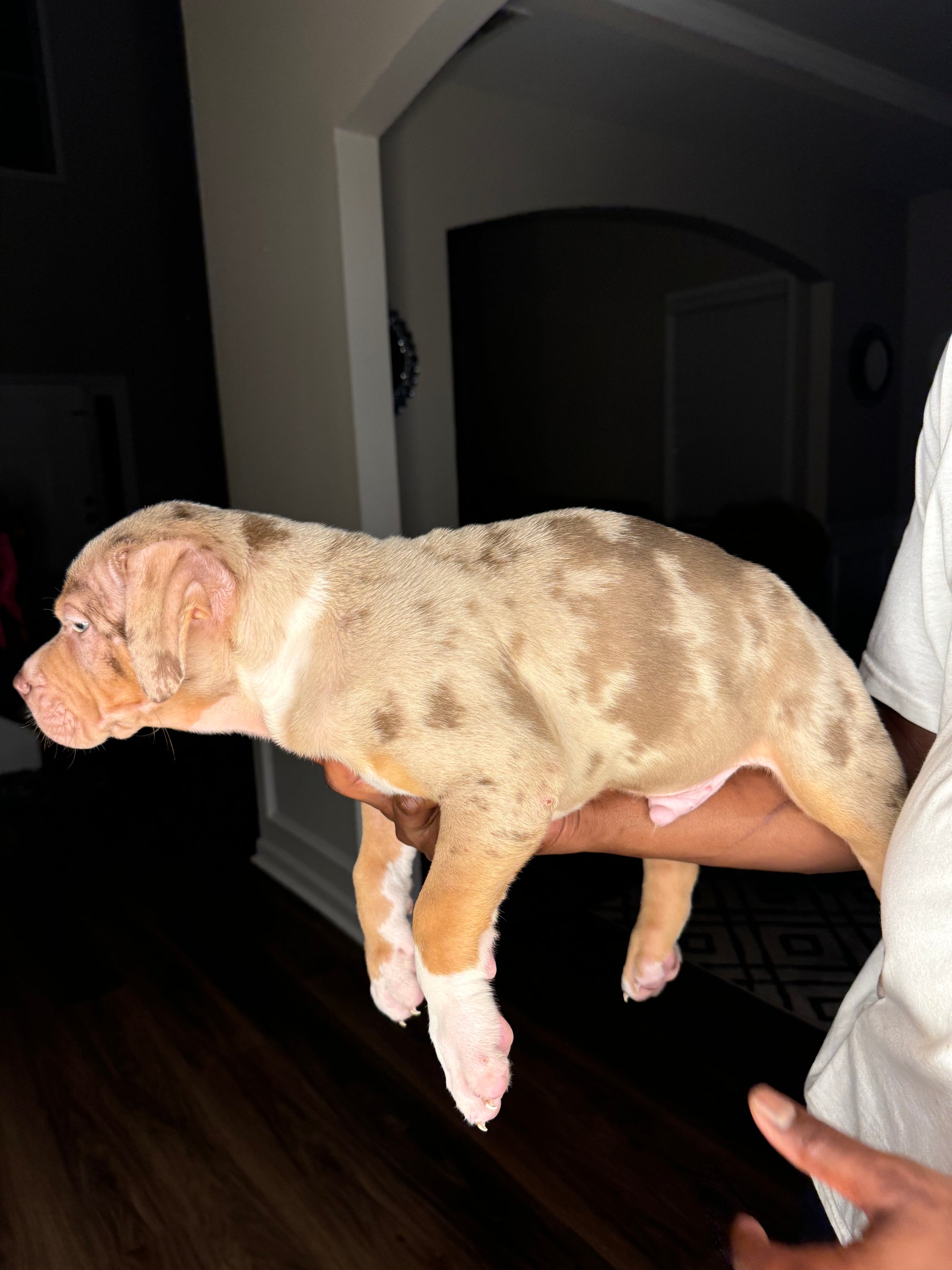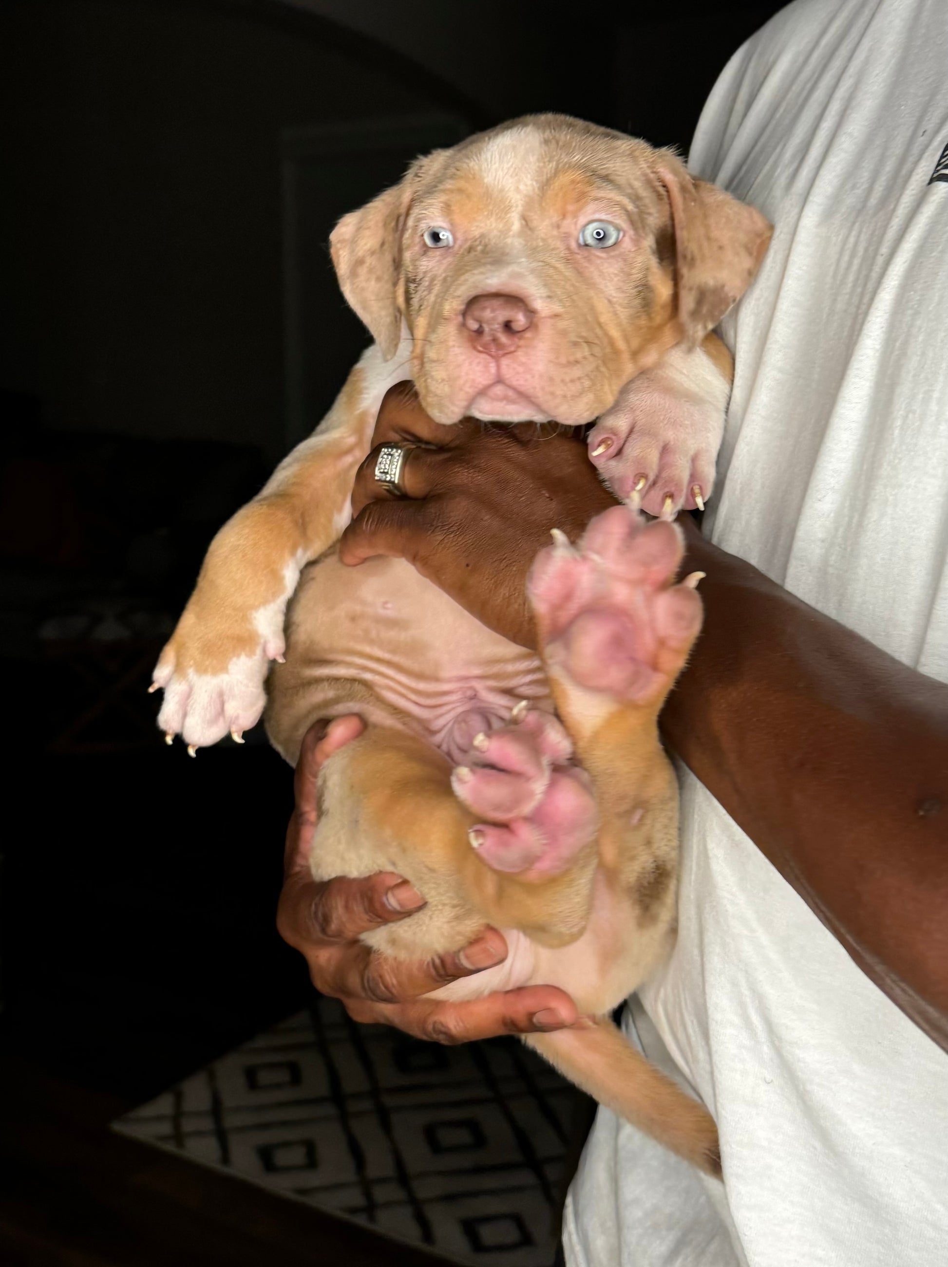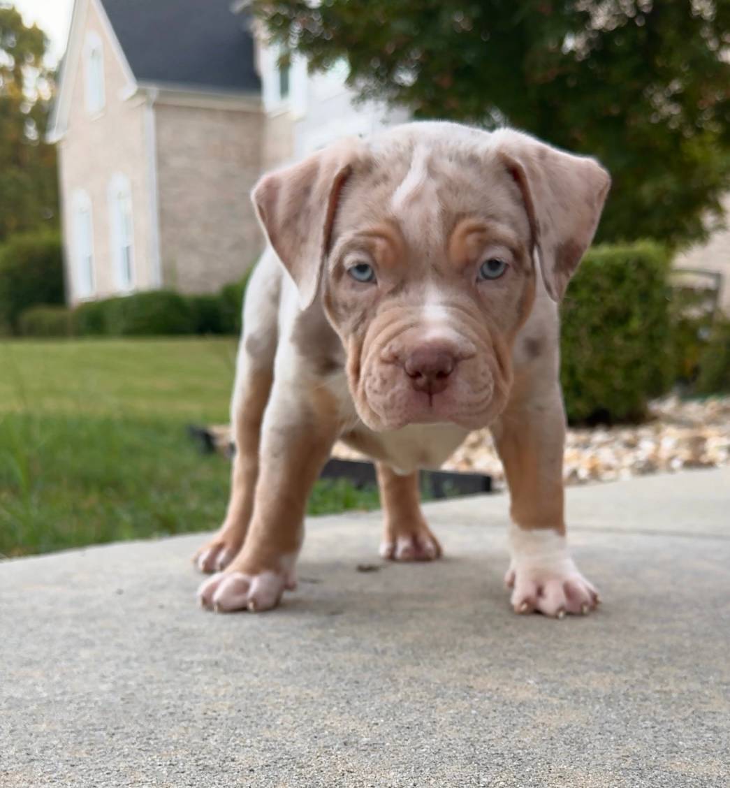 King is an ABKC registered (lilac/tri merle) XL American Bully, with an amazing bloodline(bossy). Price is $1,700 (without papers). His dad (Bless) is the grandson of Gatorhead’s Whopper, and his Mom (Melanin) is the daughter of Bossy’s Rome. He is vet checked and up to date on shots and deworming. His mother is a chocolate tricolor with the sweetest temperament. His father is a very clever and friendly, lilac/tri merle. King and both of his parents are well socialized in a loving family atmosphere. Contact 404-647-0074, we are happy to answer your questions, we also offer facetime.