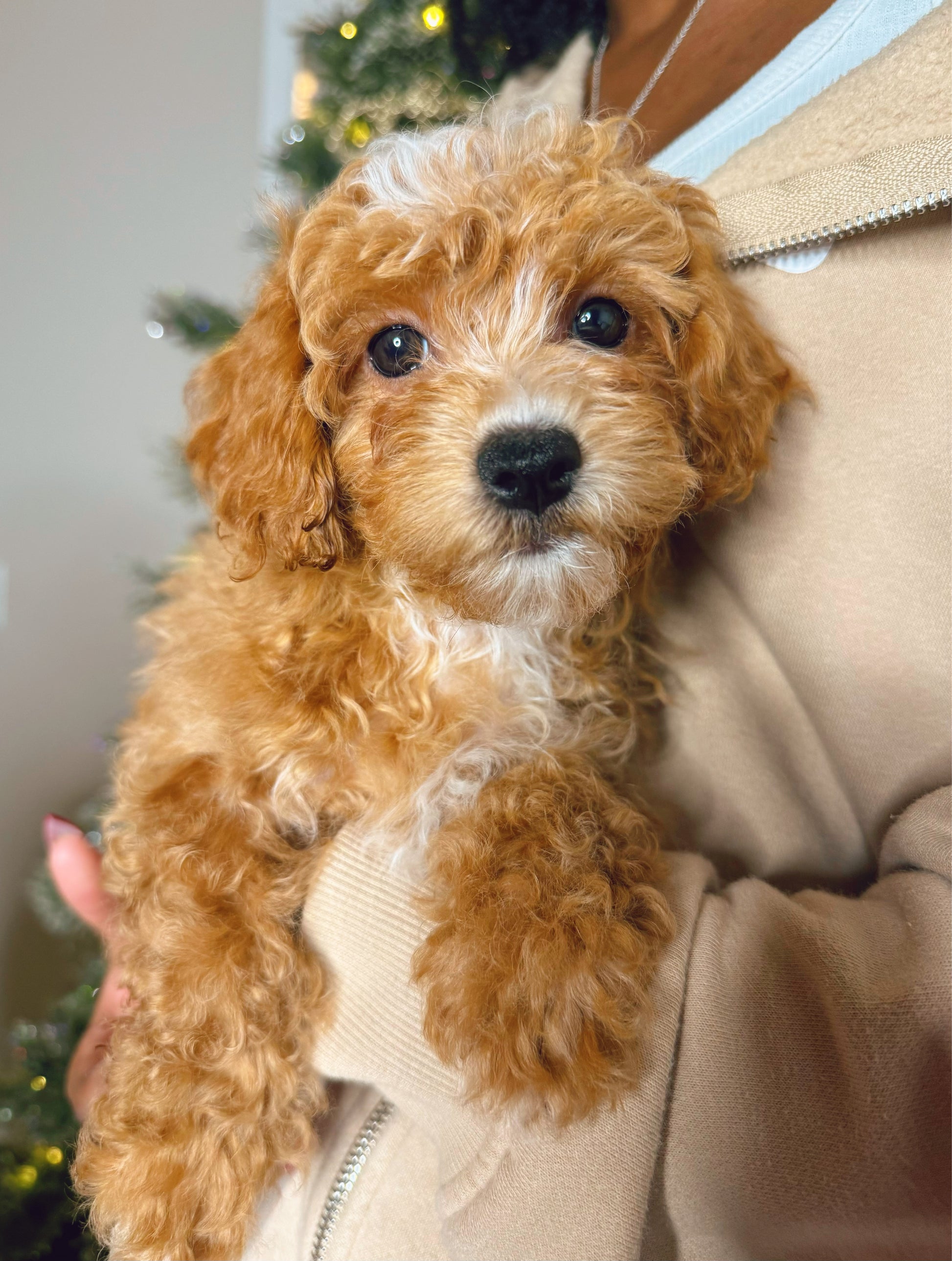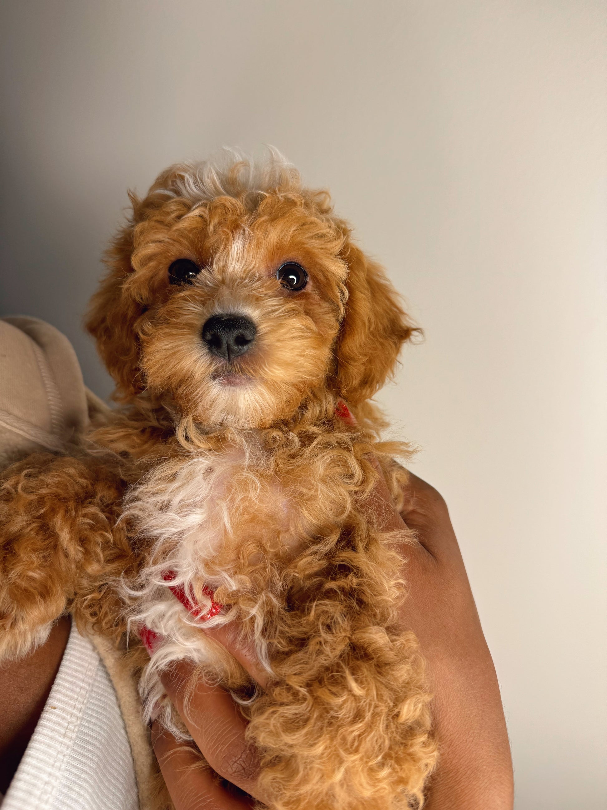 Lily is a very sweet F1 maltipoo puppy who loves people. She has a beautiful red coat with white markings. Lily will join her new family current on vaccinations and dewormer. She has received lots of love and attention which has helped build great confidence. Lily was born 9/9/24 and is expected to weigh approximately fifteen pounds full grown.