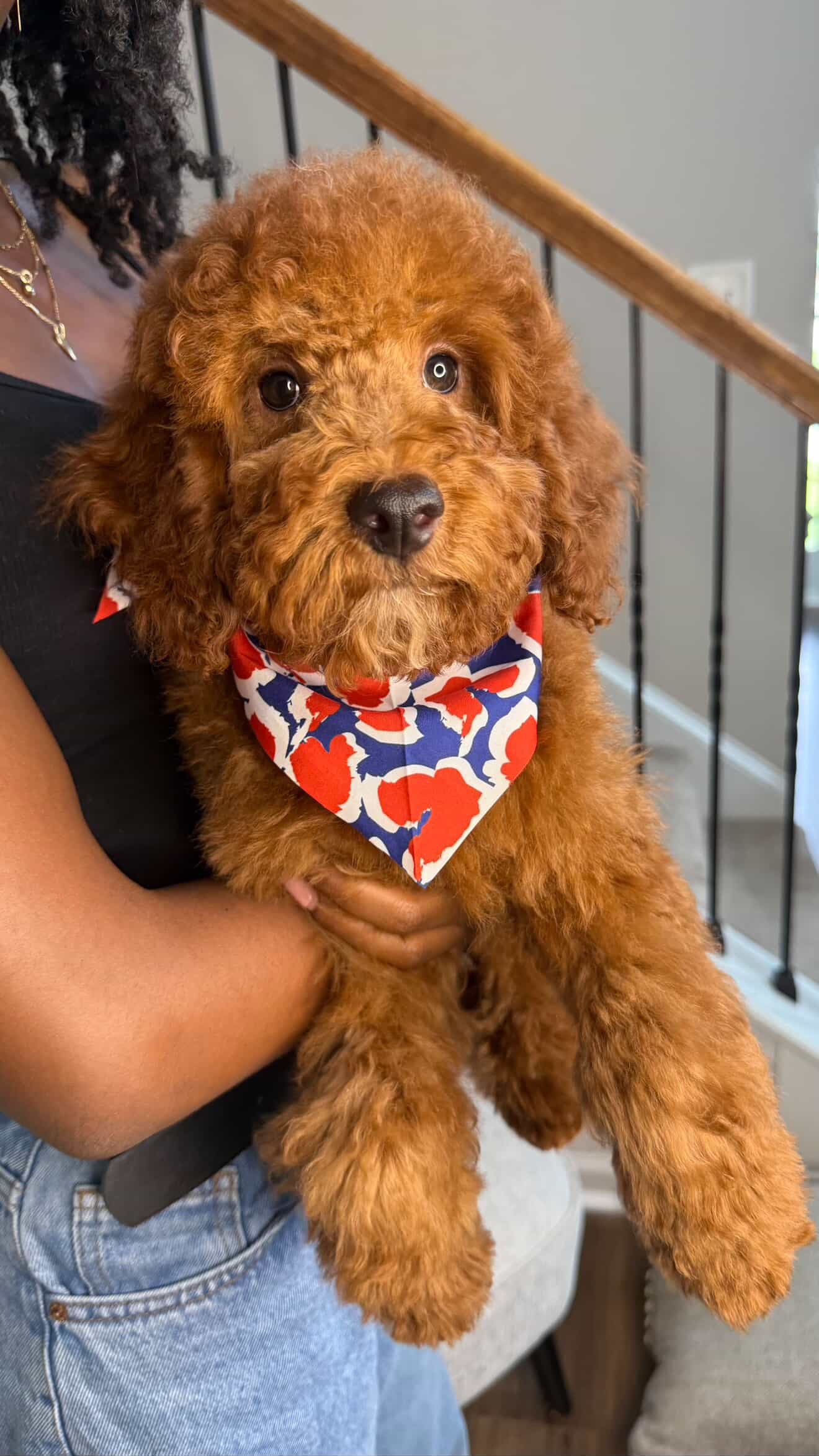 Say hello to Marlon – a lovable, playful F1B Goldendoodle with a gorgeous red coat and beautiful curls! Marlon is temperament tested, vaccinated and ready to add more love to your home.