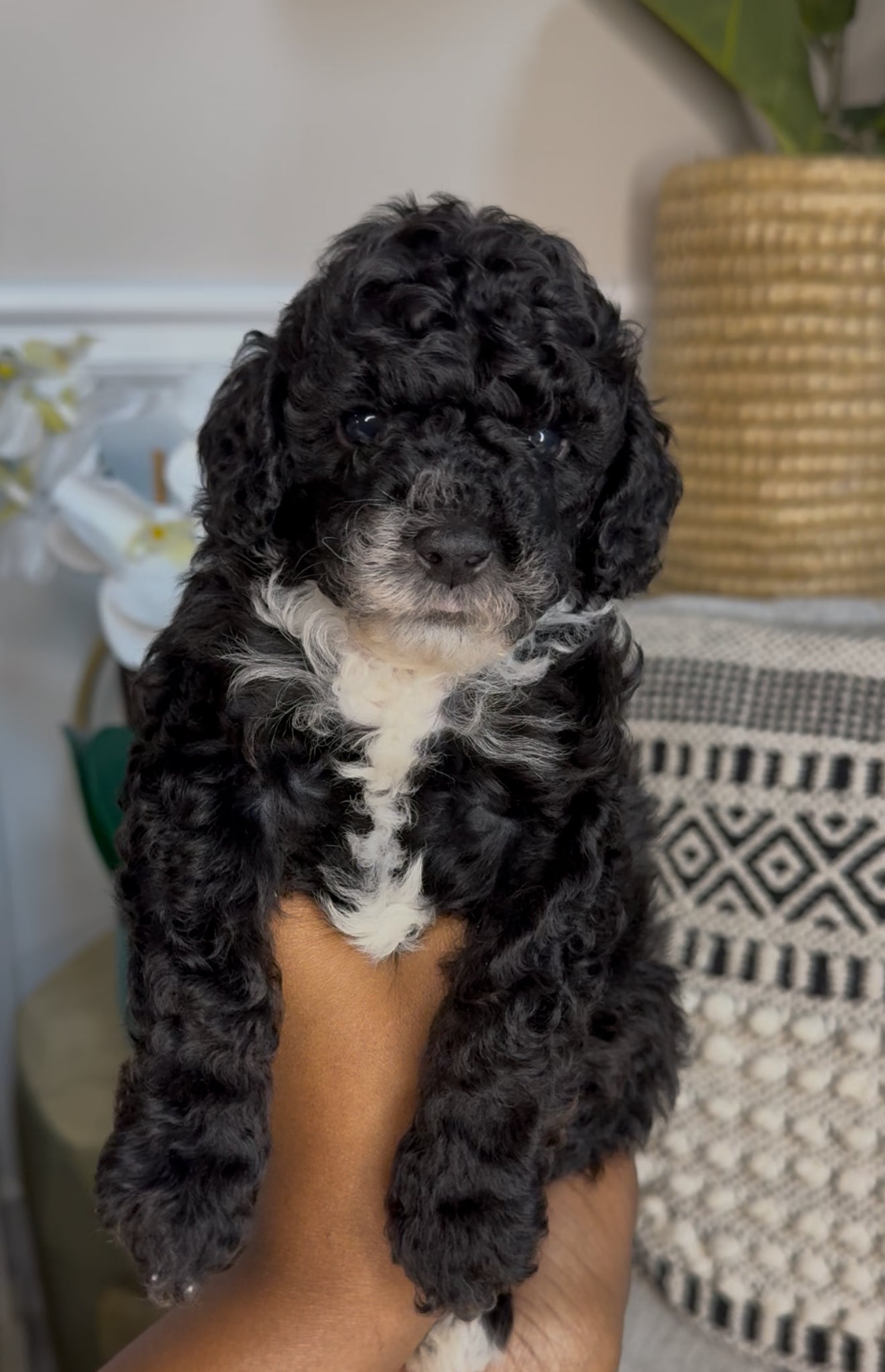 Say hello to Ocho, our sweet Cockapoo black male with beautiful white markings! Born on June 28, 2025 Ocho is a perfect blend of the affectionate Cocker Spaniel and the intelligent, hypoallergenic Poodle — giving you the best of both worlds.