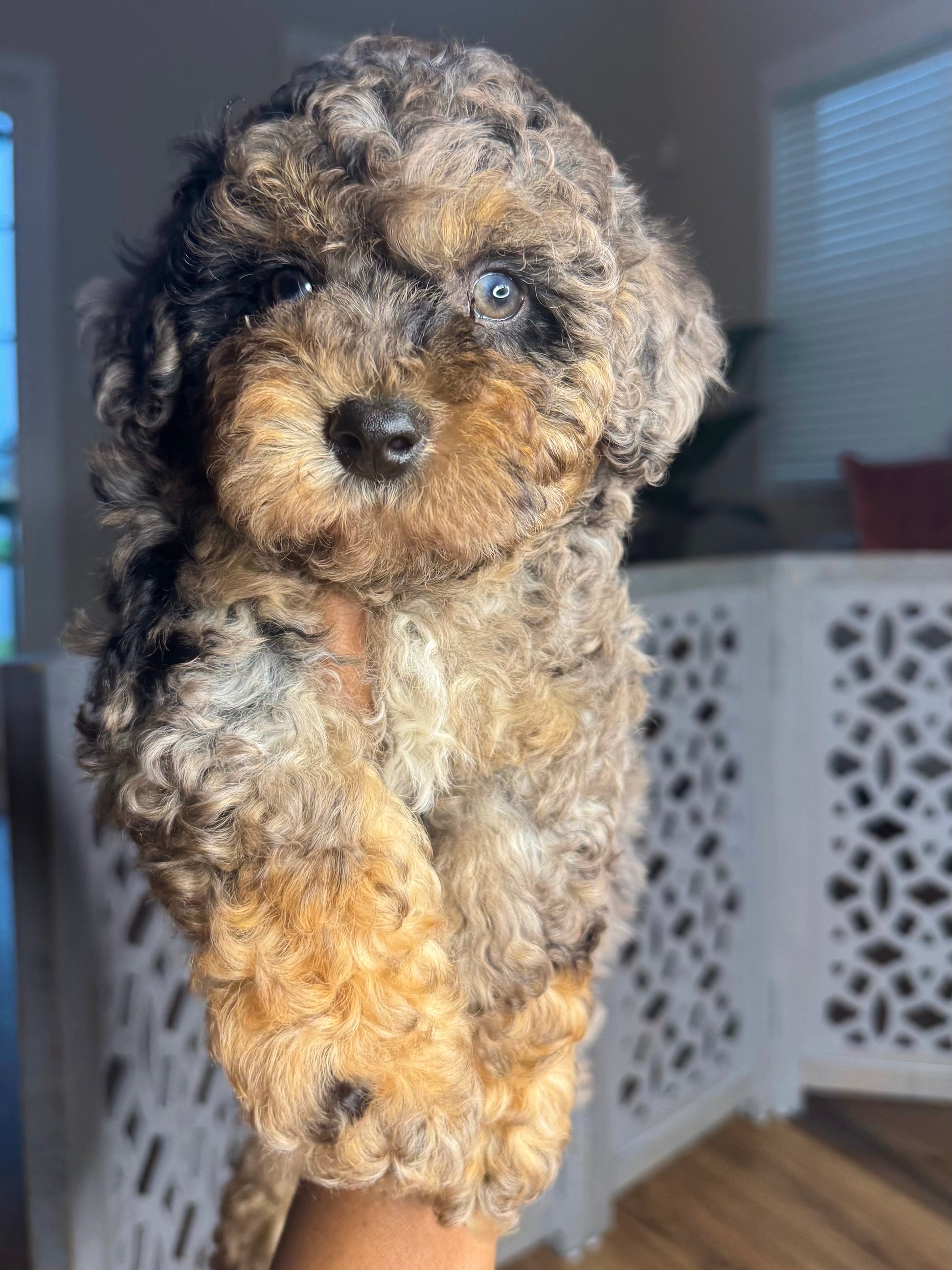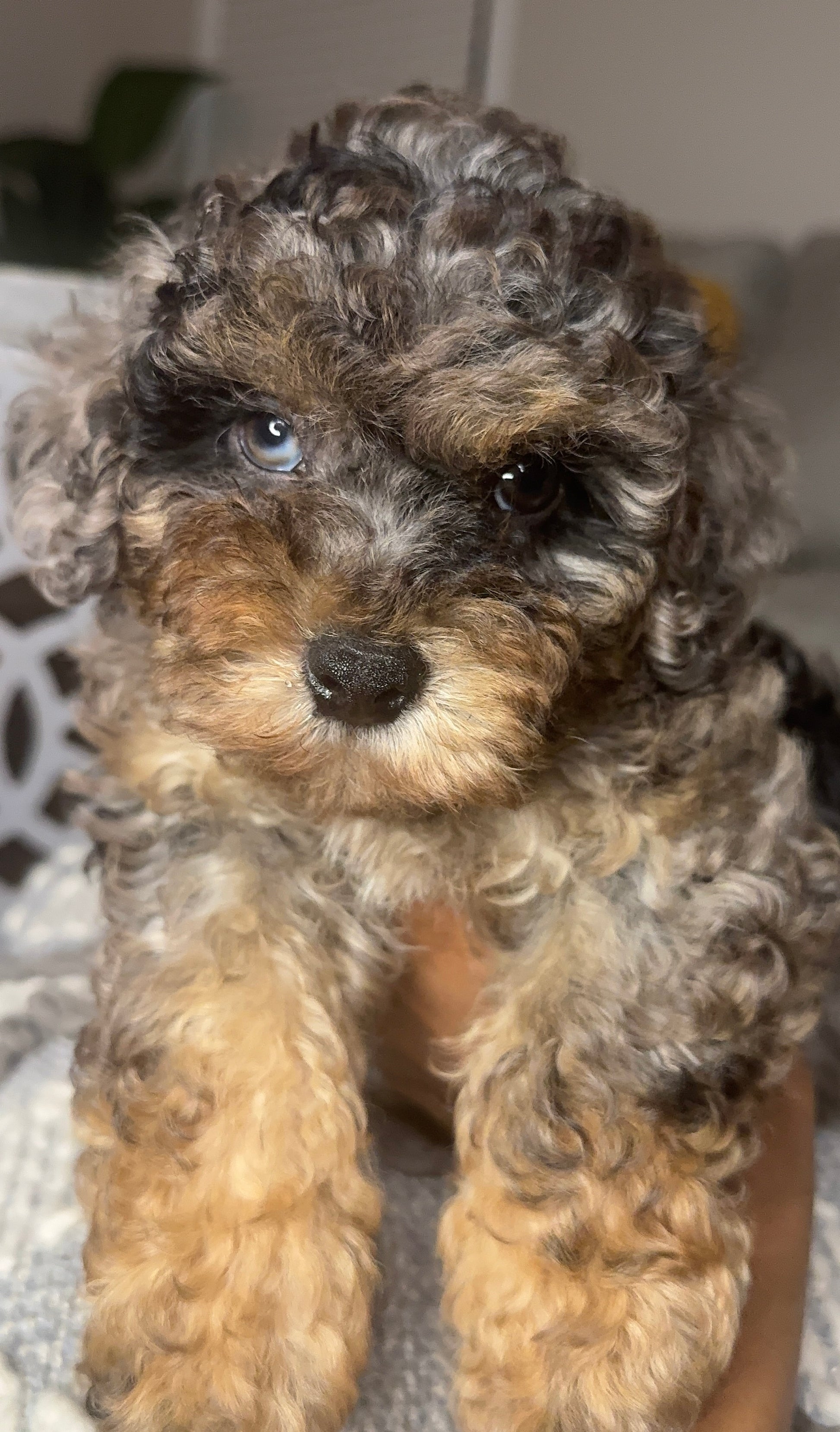 Oreo is a charming Shihpoo with an irresistible merle coat accented by beautiful marble-like eyes. With his striking appearance, matched by his calm and loving temperament, Oreo is sure to capture your heart.