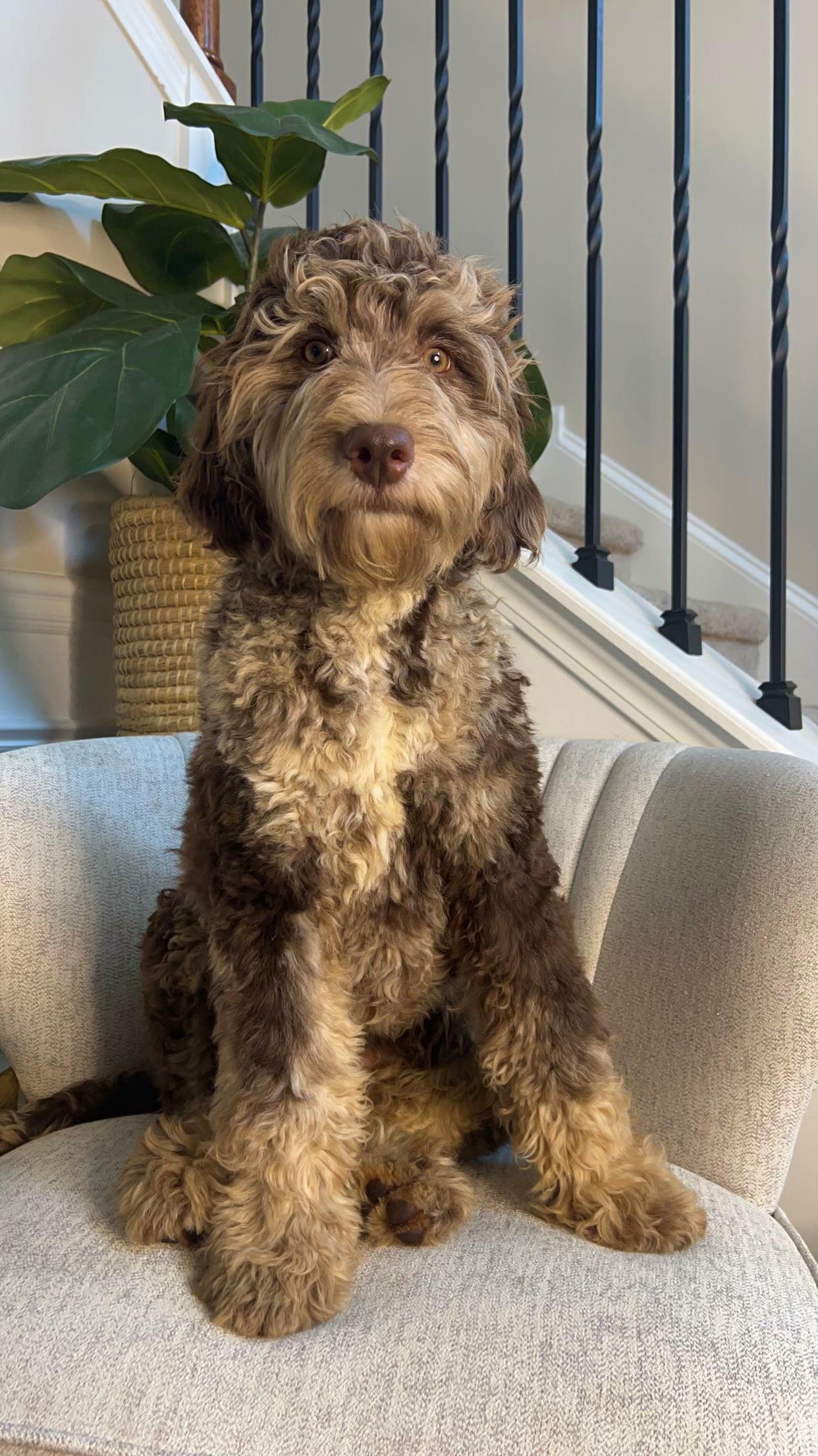 This is a Male Chocolate Tri Merle coat Standard Goldendoodle puppy. He is very playful and easy to fall in love with. With training he would make a great Emotional Support Service Dog.