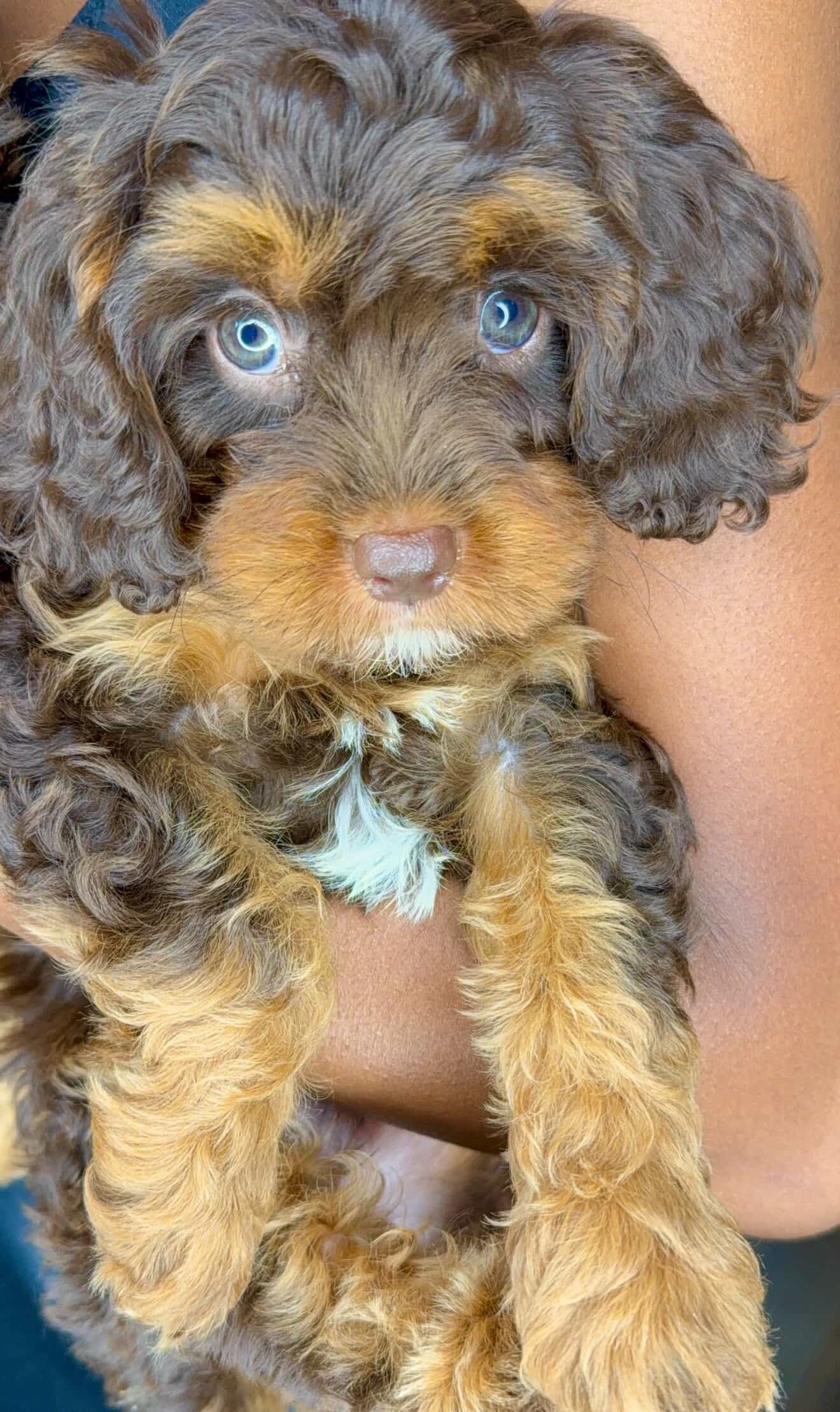 Say hello to Tito, a stunning male Cavapoo with a rich chocolate tricolor coat and gorgeous curls. With his sweet, gentle nature and playful personality, Tito is the perfect mix of cuddle buddy and adventure partner.